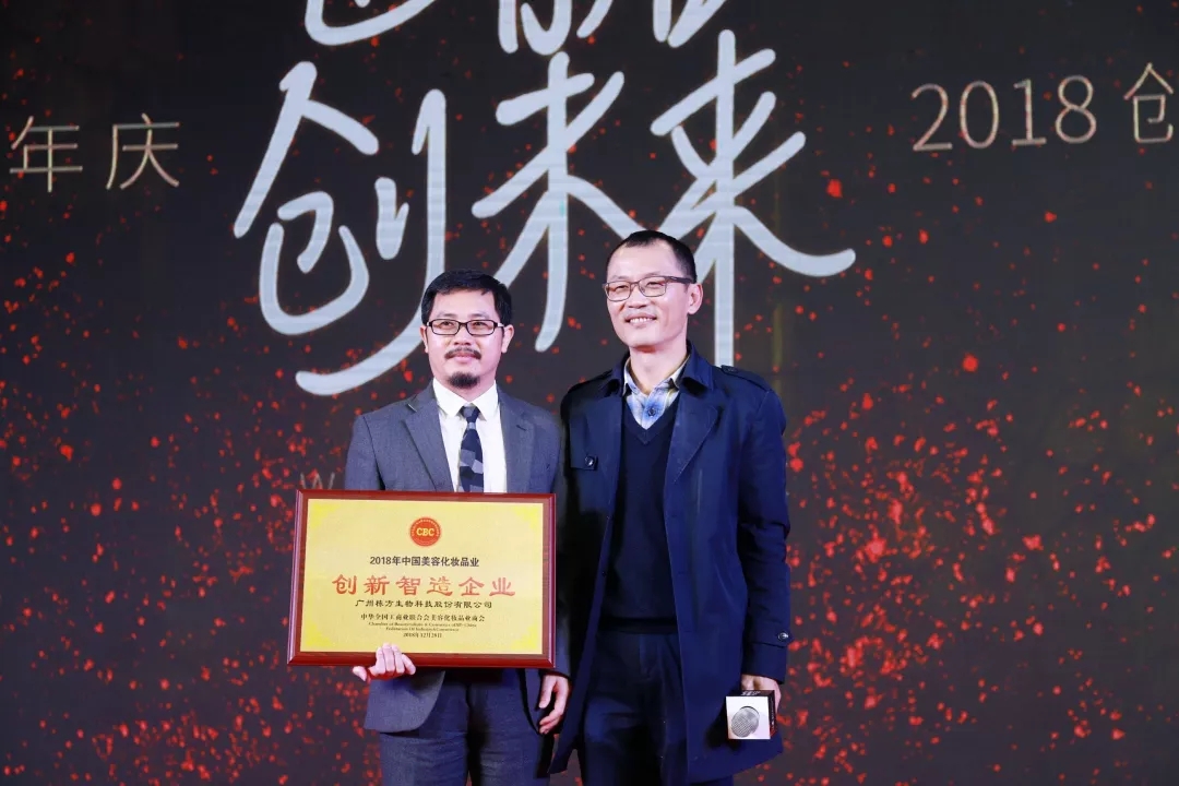 隨后,青島金王總經(jīng)理唐風(fēng)杰先生,中國(guó)美妝總經(jīng)理桂紹元先生、中華全國(guó)工商聯(lián)合會(huì)美容化妝品業(yè)商會(huì)蔡永忠副會(huì)長(zhǎng)先后上臺(tái)致辭,對(duì)棟方股份集團(tuán)近幾年的卓著成就給予高度肯定,對(duì)行業(yè)發(fā)展發(fā)表了頗有見(jiàn)地的分享。蔡永忠副會(huì)長(zhǎng)代表中華全國(guó)工商聯(lián)合會(huì)美容化妝品業(yè)商會(huì)給棟方股份集團(tuán)20周年帶來(lái)了一份驚喜的生日禮物,為棟方股份頒發(fā)了“創(chuàng)新智造企業(yè)”大獎(jiǎng),回顧棟方股份2018年的累累碩果,這一榮譽(yù),實(shí)至名歸。