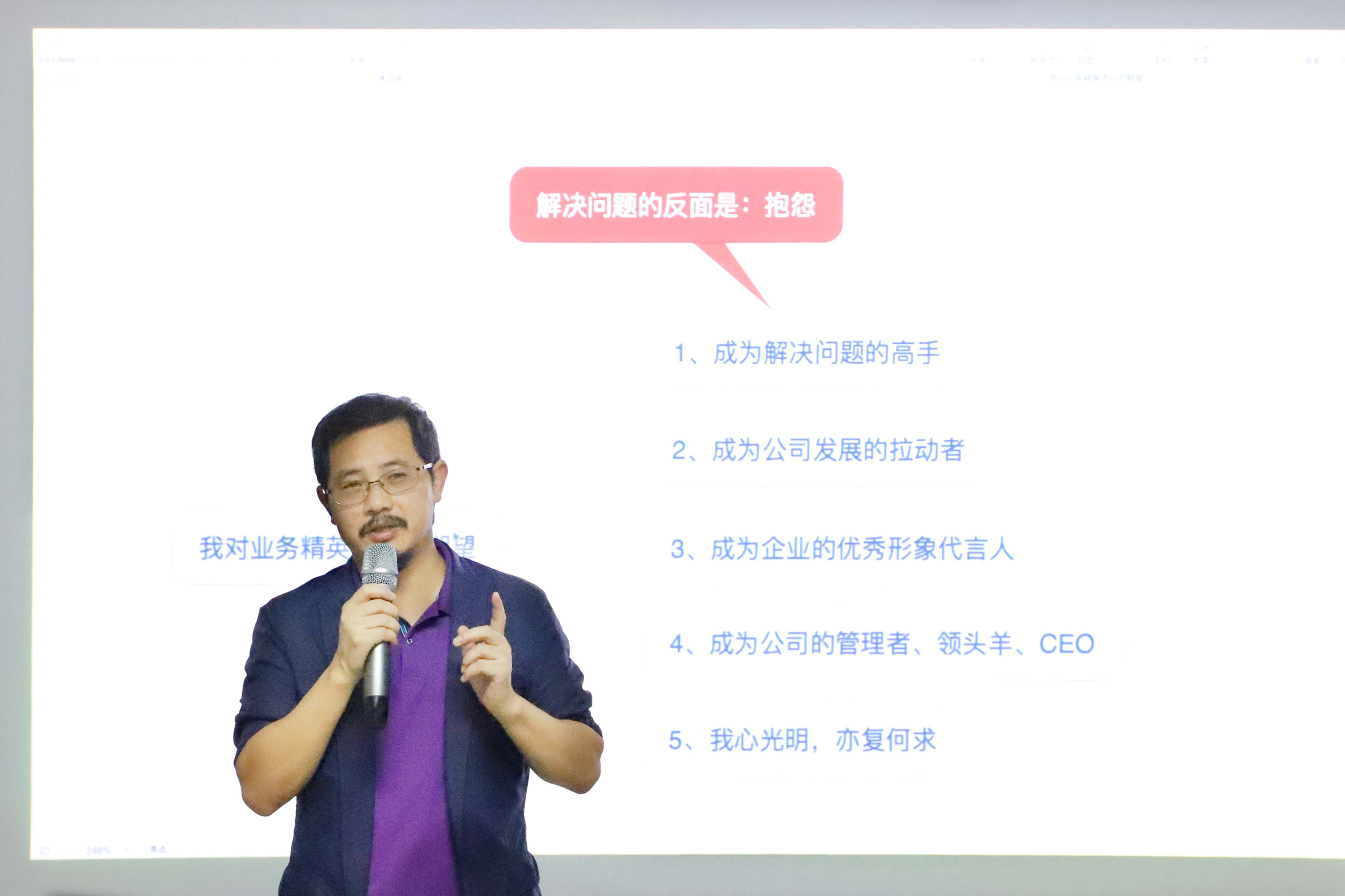在講話中,唐總提出了對精英團隊的期望——只有成為解決問題的高手,具備自我驅動、不斷學習、目標清晰簡單、講究效率、懂得利他、懂得敬畏的能力,才能稱之為精英。鼓勵學員成為公司發(fā)展的拉動者,成為企業(yè)的優(yōu)秀形象代言人,乃至成為公司的管理者、領頭羊。